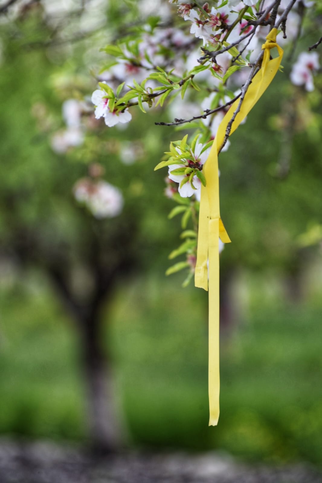 * את הסרט המלופף על השקדים ואת עלה השקדיה שנתקע על ענף קוצני צילמתי בסוף יום עם קהילת נחל עוז במשמר העמק. מול משמר העמק יש מטע שקדיות. הרגשתי שהוא קורא לי. היה שם ריח מתוק ויופי שעולה על גדותיו ויחד עם זאת שברירי ופגיע.